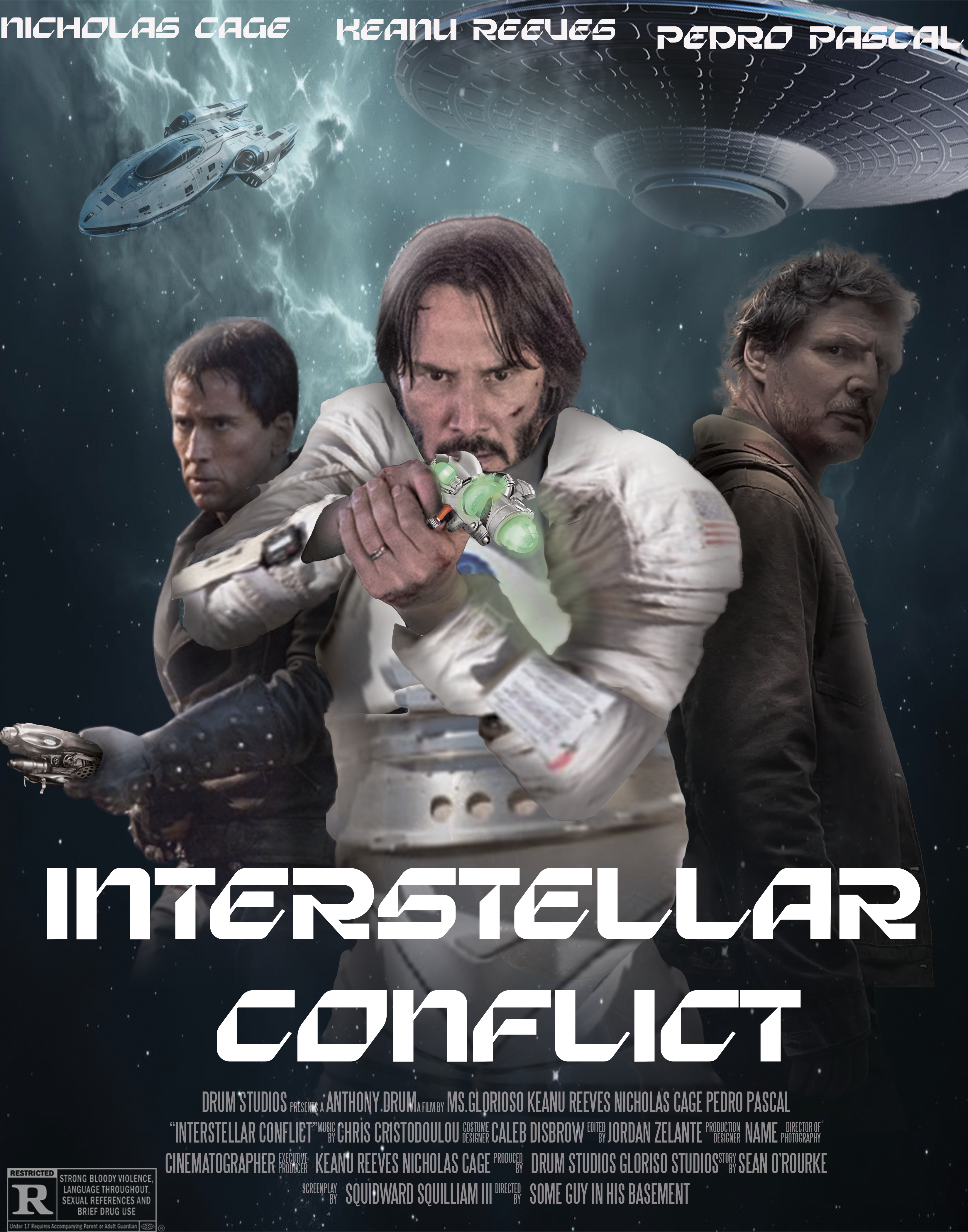 Interstellar Conflict was a project where we were tasked with making an animated and interactive movie in space. And with me being the overachiever that I am, I decided to make a fake movie poster for it. This process took a very long time, but was worth it in the end. The spacesuit, and guns were not originally there on the characters! I added them using the warp tool to shape the suits onto the characters. Still looking at it, I am impressed with how good I was able to make the poster.
