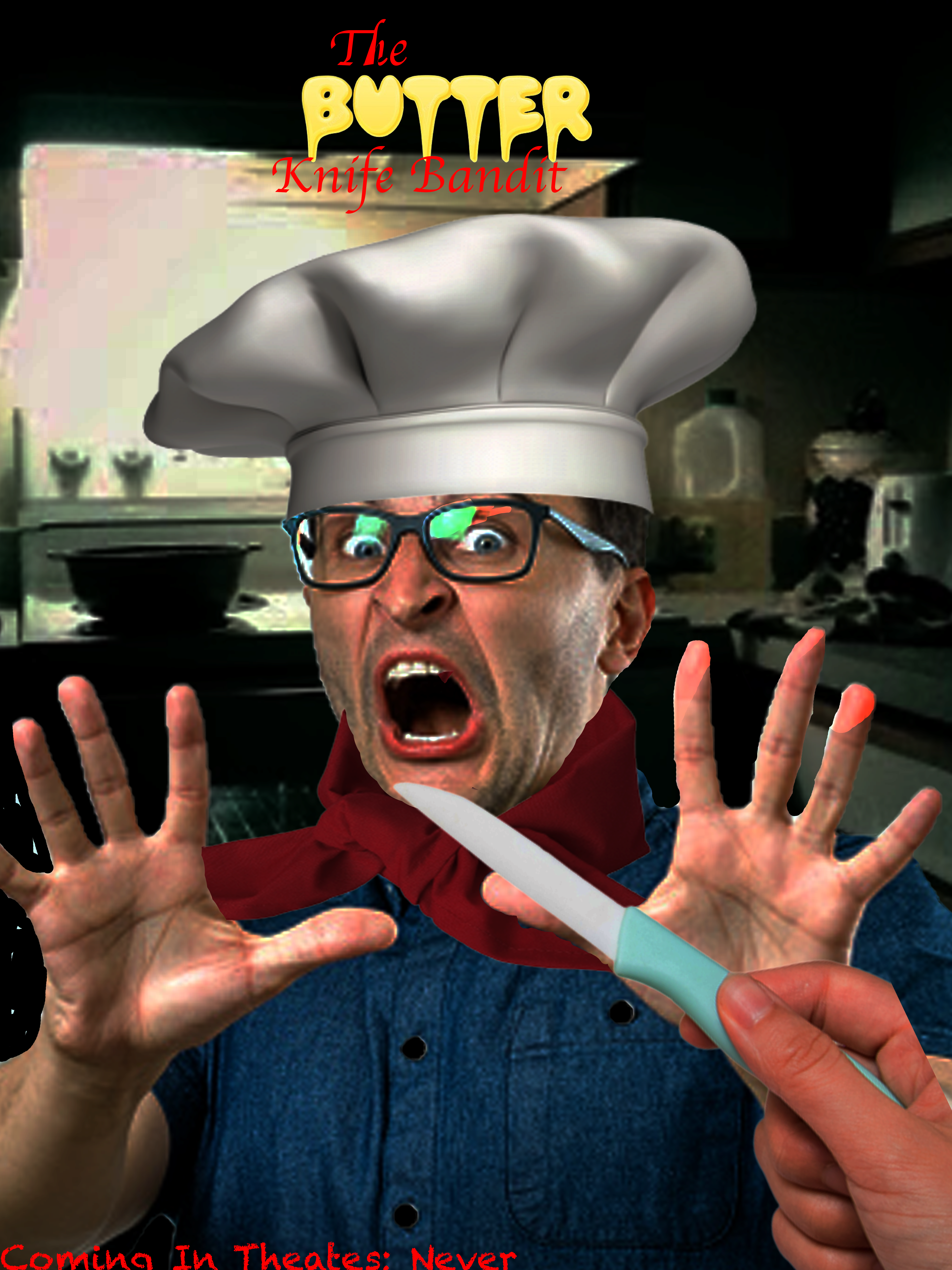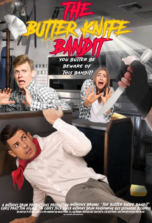 The Butter Knife Bandit was one of the first Photoshop projects I have ever done all the way back in my freshman year of high school. As you can see from the first picture, it obviously wasn’t perfect. From the main character to being very saturated, to the hat and ascot not really fitting in, to the background being very blurry, you can clearly see that this was my first time using photoshop. But for my first time, it wasn’t really all too bad. I did decide to go ahead and do a remaster of this image in my sophomore year and looking back on it, I think I did a pretty good job. This also shows you how much I have improved with this program over the course of just a year, which the difference between the two is crazy. I then also went on to create various other sequel posters for the Butter Knife Bandit, but didn't put them on here as it would take up too much space.